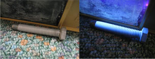 Photograph 1 – A bolt coated with one version of the Illumi-LayerTM coating with light emitting particles and photographed under normal (left) and ultraviolet light (right) to reveal the coating’s unique luminescence.